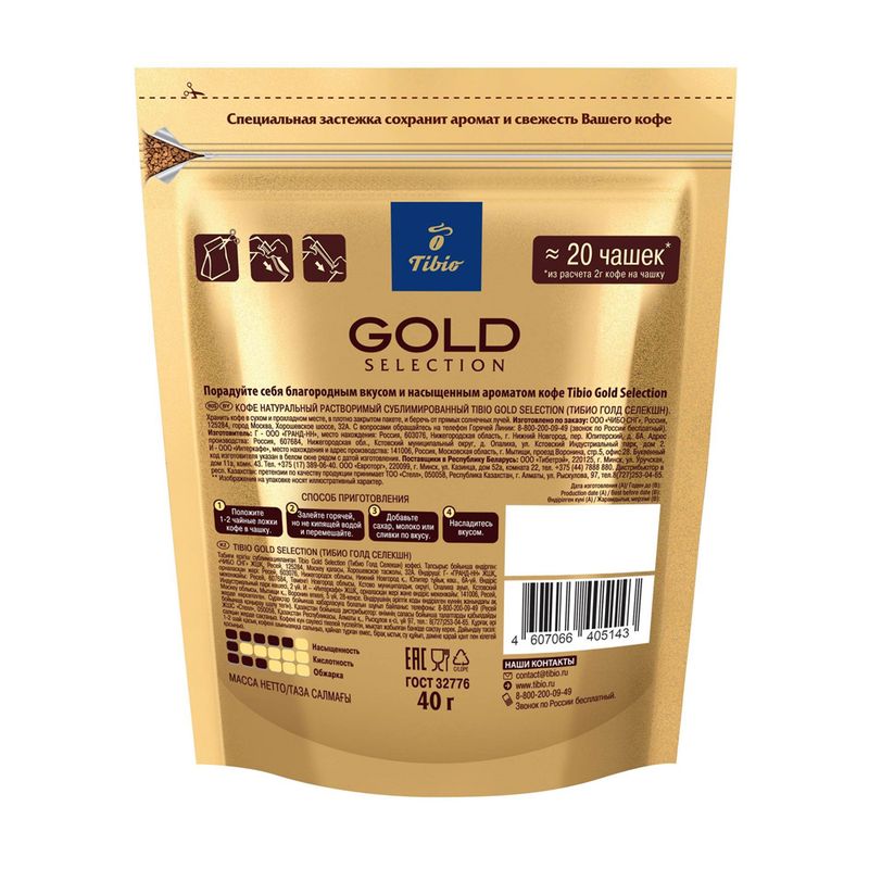 Кофе растворимый "Gold Selection", Tibio – это благородный напиток с насыщенными вкусом и ароматом в удобном формате. Упаковки хватит приблизительно на 20 чашек напитка (из расчёта 2 г кофе на чашку). Сублимированный. Упаковка с застёжкой zip-lock сохраняет свежесть и аромат продукта. Способ приготовления указан на упаковке. Масса нетто: 40 г.