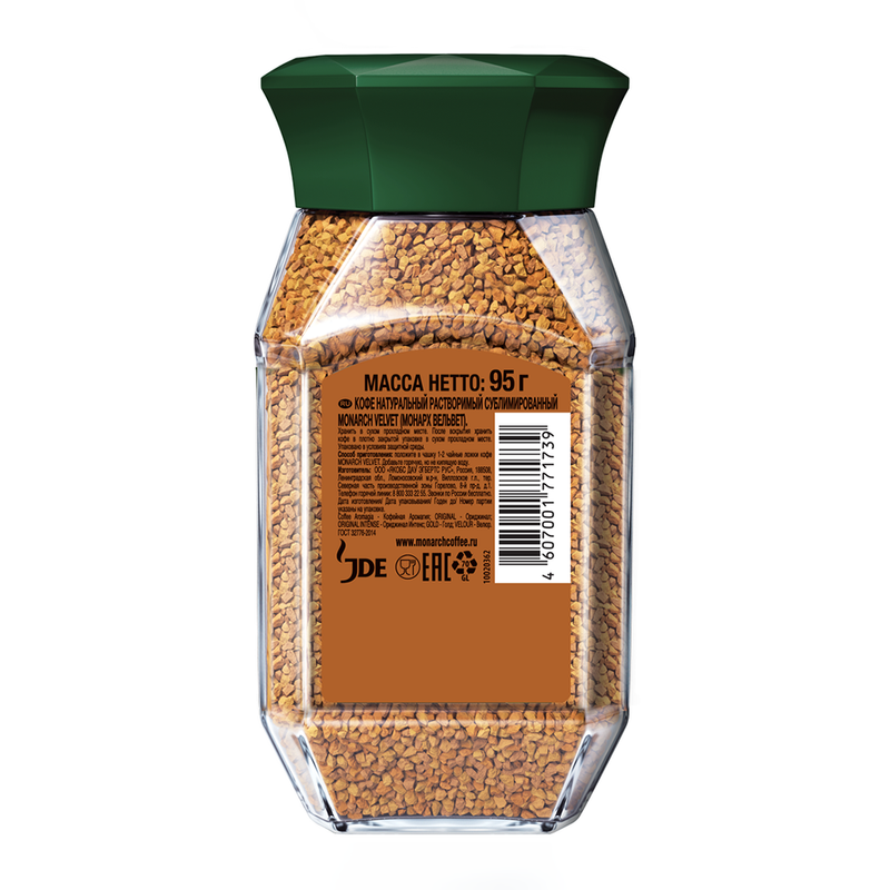 Кофе натуральный растворимый, MONARCH VELVET, имеет мягкий вкус и насыщенный аромат. Отличный выбор для завтрака или перерыва на работе. Сублимированный. Масса нетто: 95 г. Стеклянная банка.