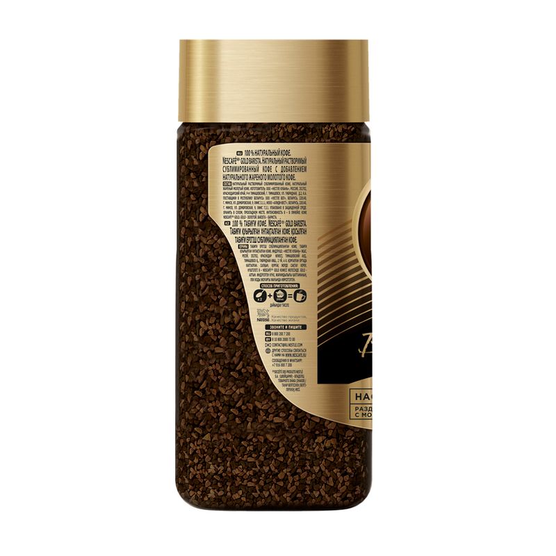 Кофе растворимый "Gold Barista", Nescafe, наполнит Ваше утро яркими впечатлениями и подарит заряд бодрости! Два вида зёрен с разной обжаркой придают напитку насыщенный вкус и яркий аромат. Насыщенность: 8/10. Сублимированный. Масса нетто: 85 г.