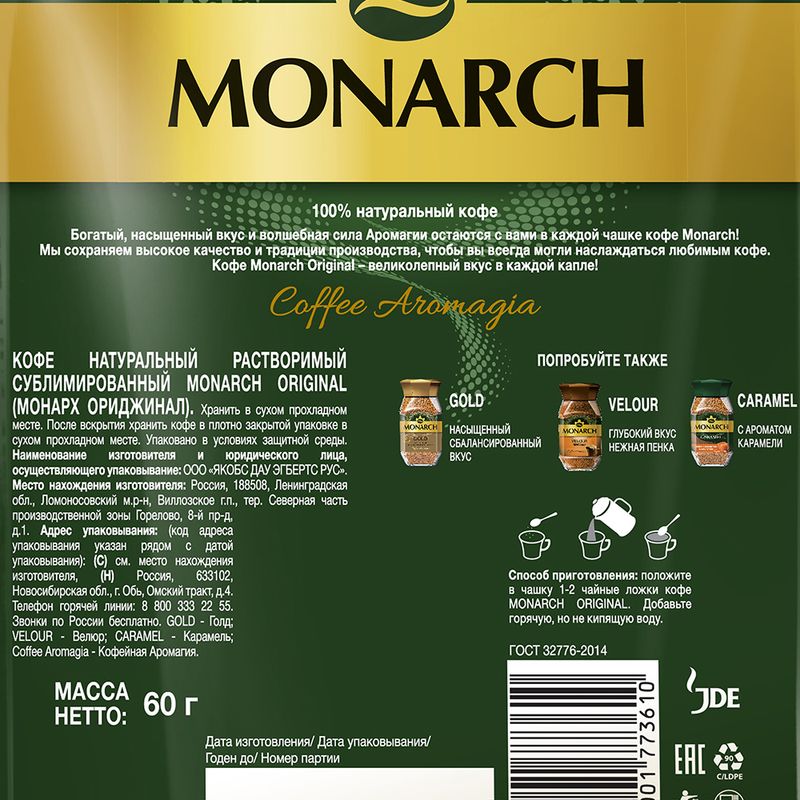 Кофе натуральный растворимый, MONARCH, с арабикой порадует Вас богатым, насыщенным вкусом и ароматом. Упаковка с зип-застёжкой сохраняет аромат кофе. Способ приготовления указан на упаковке. Масса нетто: 60 г.