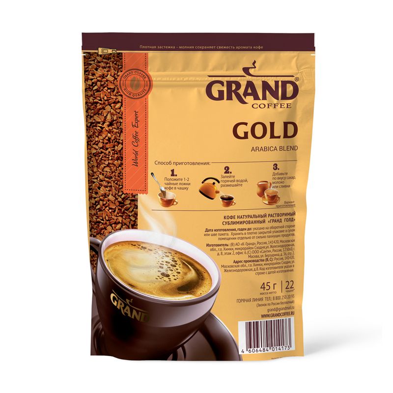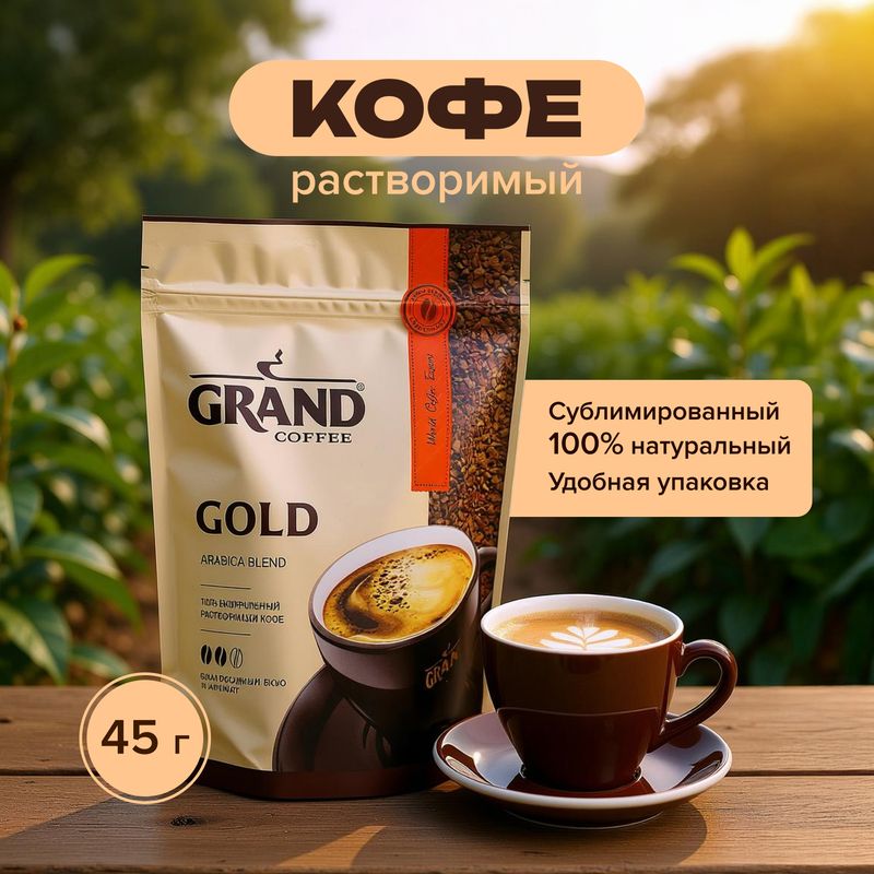 Кофе растворимый "GOLD", GRAND, подарит Вам мягкий, бодрящий вкус и насыщенный аромат. 100% натуральный. Сублимированный. Удобная упаковка с зип-замком. Способ приготовления указан на упаковке. Масса нетто: 45 г.