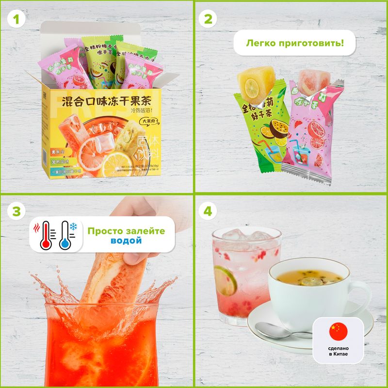 Растворимый чайный напиток порадует ярким вкусом фруктов! Удобный формат – достаточно залить брикет горячей или холодной водой. Для освежающего летнего варианта можно добавить в напиток лёд. В упаковке 5 брикетов по 10 г: 2 брикета со вкусом красного грейпфрута и жасминового чая и 3 со вкусом маракуйи, цитрусов, жасминового и зелёного чая. Способ приготовления указан на упаковке. Масса нетто: 50 г.