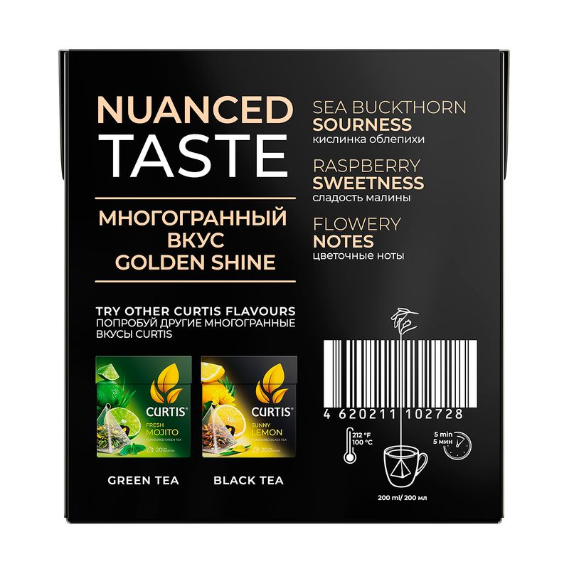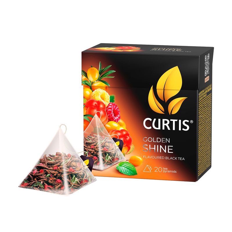 Чай чёрный "Голден Шайн", CURTIS — ароматный терпкий напиток с фруктово-ягодными нотами и насыщенным вкусом. Упакован в пирамидки, которые позволяют чайным листьям лучше раскрывать аромат и цвет. Способ приготовления указан на упаковке. В упаковке 20 пирамидок по 1,7 г.