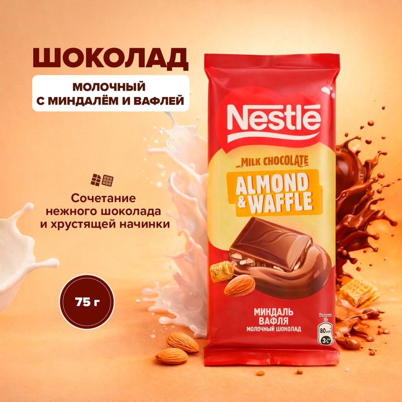 Шоколад молочный, Nestle, с миндалём и вафлей, 75 г