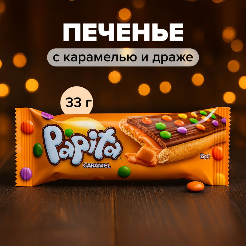 Печенье, Papita – это оригинальный десерт, который станет прекрасным дополнением к чаю или кофе. Рассыпчатое печенье, мягкая карамель, шоколадная глазурь и посыпка из хрустящего драже-конфет создают неповторимое сочетание вкуса и текстур. Отличный выбор для быстрого перекуса дома, на работе или в дороге. Масса нетто. 33 г.