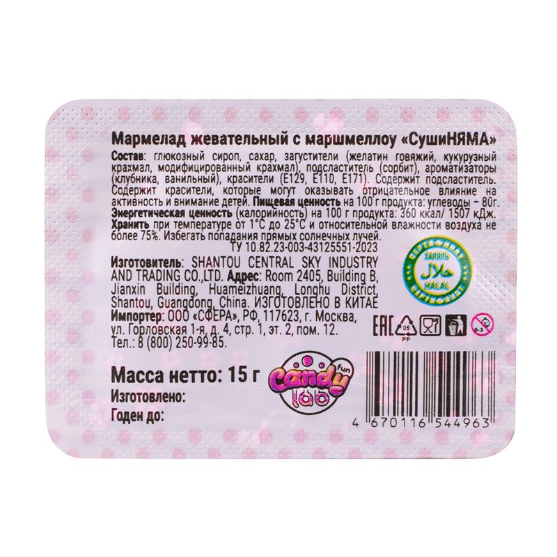 Мармелад жевательный с маршмеллоу "СушиНЯМА" – это вкусное лакомство в форме суши! Масса нетто: 15 г.