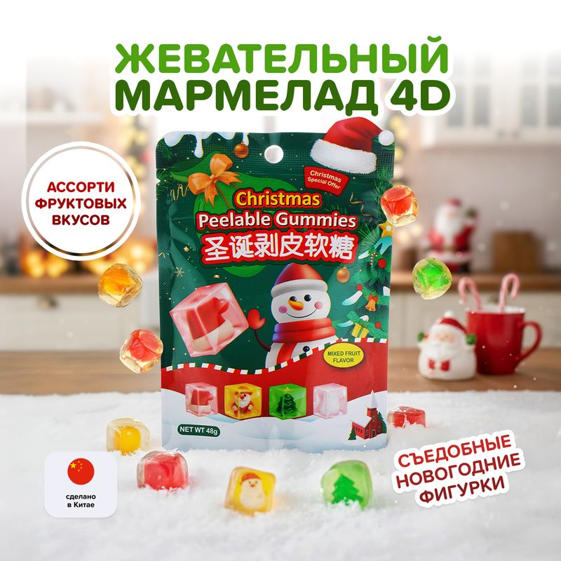 Мармелад жевательный "4D-фигурки" — съедобные рождественские фигурки, спрятанные в мармеладном кубике. Можно съесть конфетку целиком или вытащить фигурку из оболочки и съесть по отдельности. Отличный вариант оригинального новогоднего подарка! Масса нетто: 48 г.