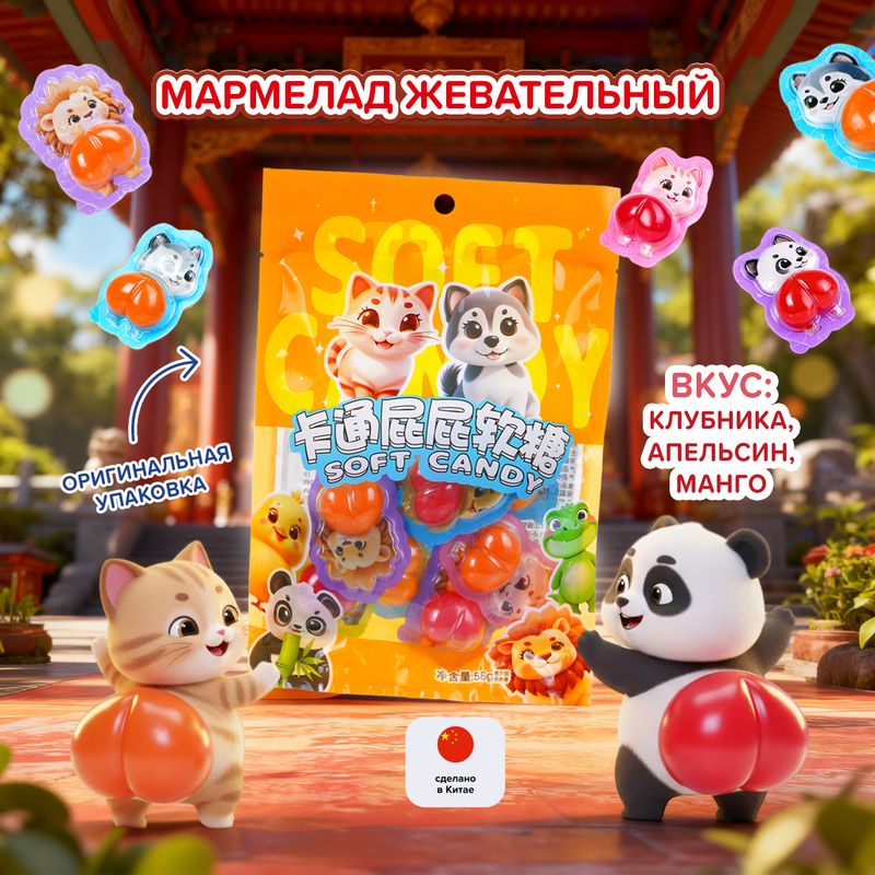 Мармелад жевательный "Ассорти вкусов" — микс сочных фруктовых конфет! Каждая в забавной упаковке со зверушкой. Внутри мармелад со вкусами клубники, манго и апельсина. Масса нетто: 58 г.