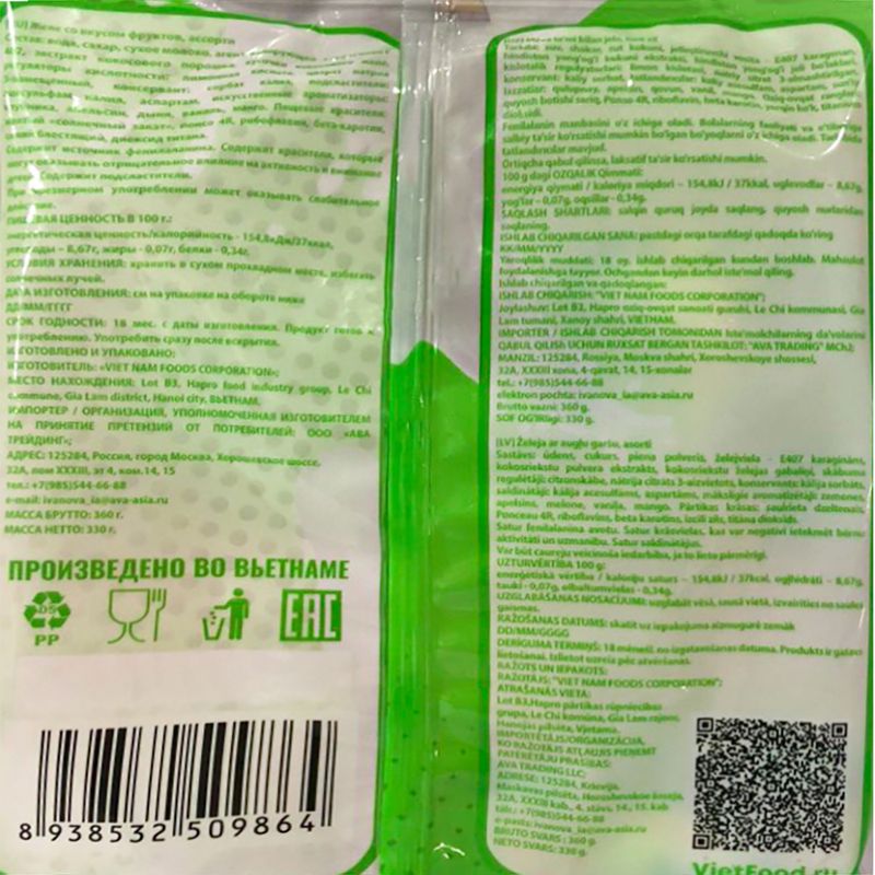 Желе со вкусом фруктов, YUMMY YUMMY – это ассорти вкусных десертов! Каждое желе в индивидуальной упаковке. Сделано во Вьетнаме. Масса нетто: 360 г.