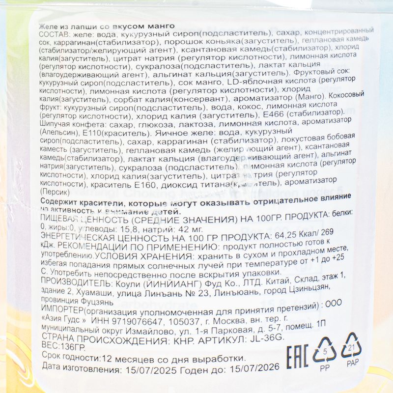Желе из лапши со вкусом манго – оригинальный десерт в удобном стакане! Выполнено в форме лапши быстрого приготовления. Масса нетто: 136 г.