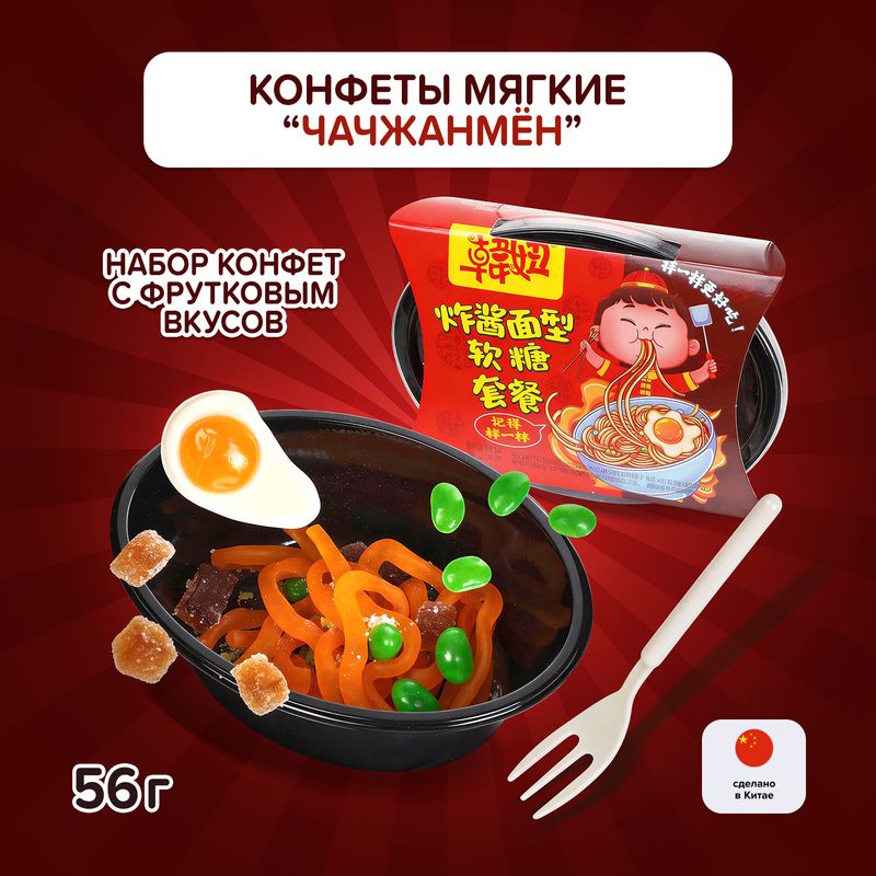 Конфеты мягкие, Чачжанмён – удивительная сладость с лапшой в сиропе! Необычное сочетание вкусов и текстур не оставит равнодушными ни детей, ни взрослых. Пробуйте и удивляйтесь! Сделано в Китае. Масса нетто: 56 г.