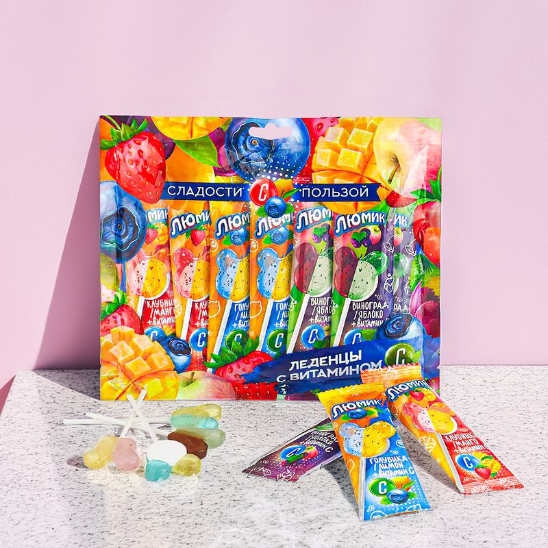 Леденцы с витамином С "Люмик" – это вкусная и полезная сладость! В упаковке 7 леденцов на палочке в 3 вкусовых сочетаниях: клубника / манго, голубика / лимон, виноград / яблоко. Каждый леденец в индивидуальной упаковке. Масса нетто упаковки: 56 г.