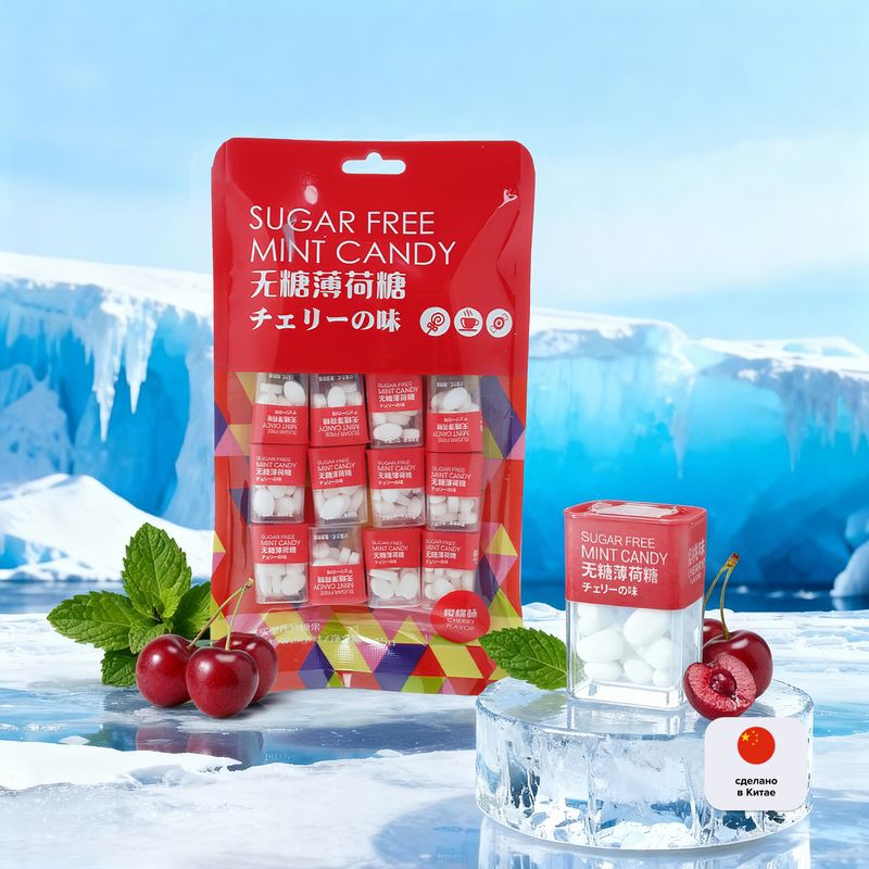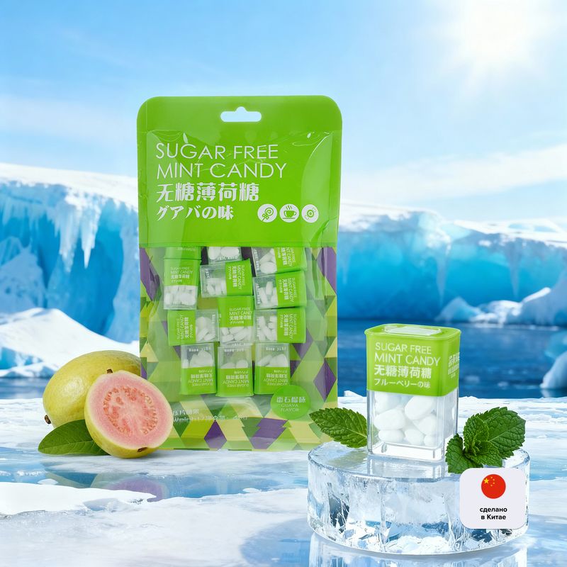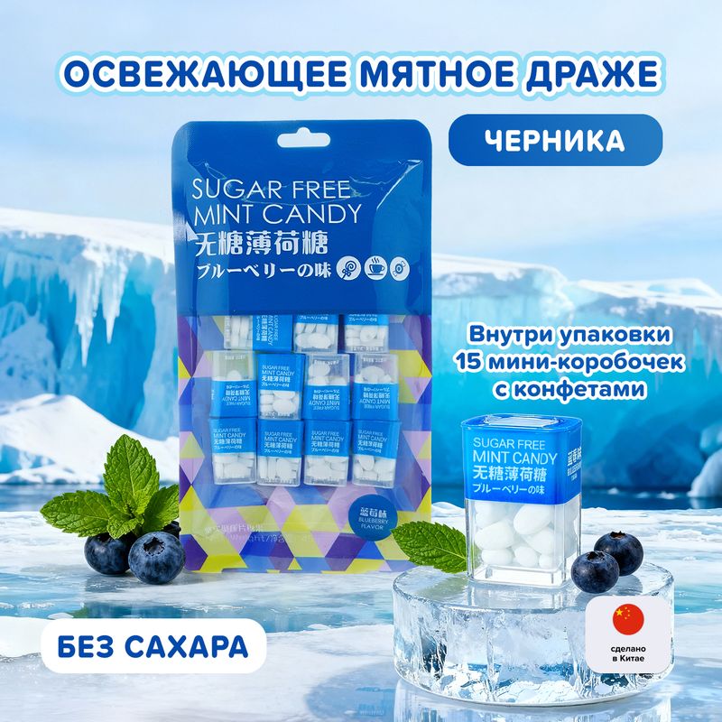 Конфеты освежающие – это мятные драже в удобном формате. В большой упаковке находится 15 мини-коробочек с конфетами, которые удобно брать с собой! Без сахара. В ассортименте представлены следующие вкусы: вишнёвый, черничный, лимонный, гуава. Масса нетто: 80 г.
