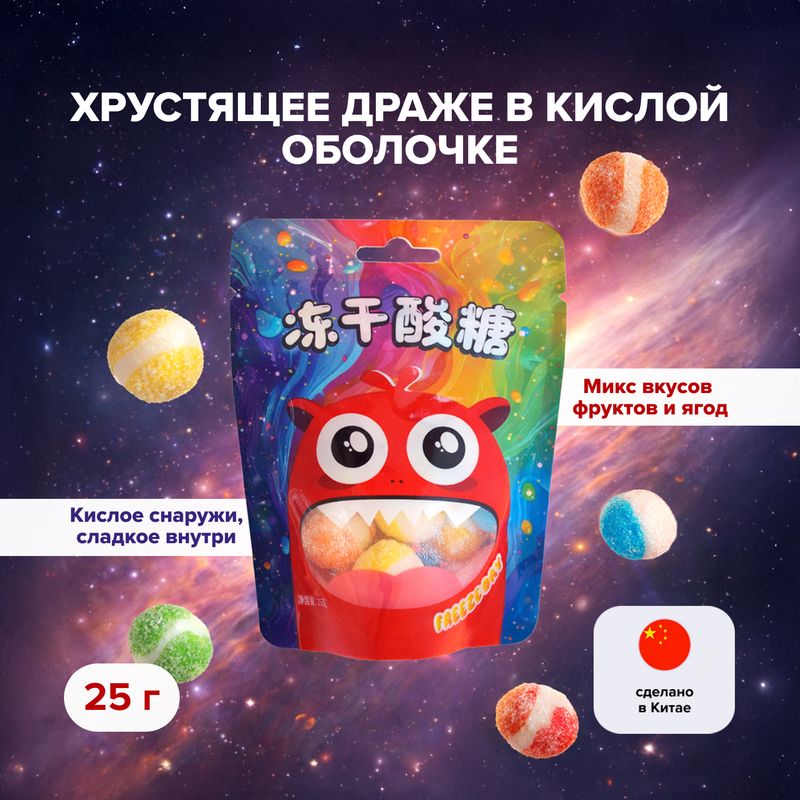 Микс хрустящего драже в кислой оболочке – это удивительное сочетание текстур и вкусов! Конфеты кислые снаружи и сладкие внутри. Со вкусом фруктов и ягод. Масса нетто: 25 г.
