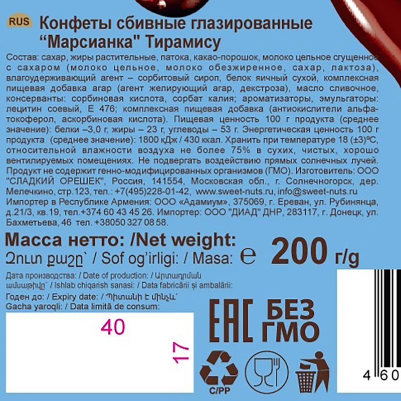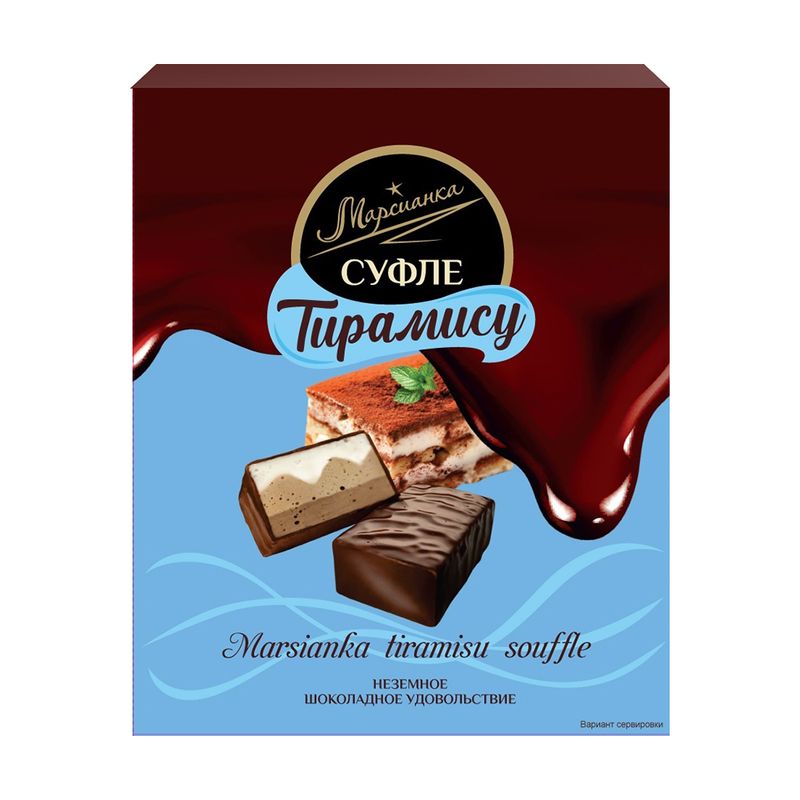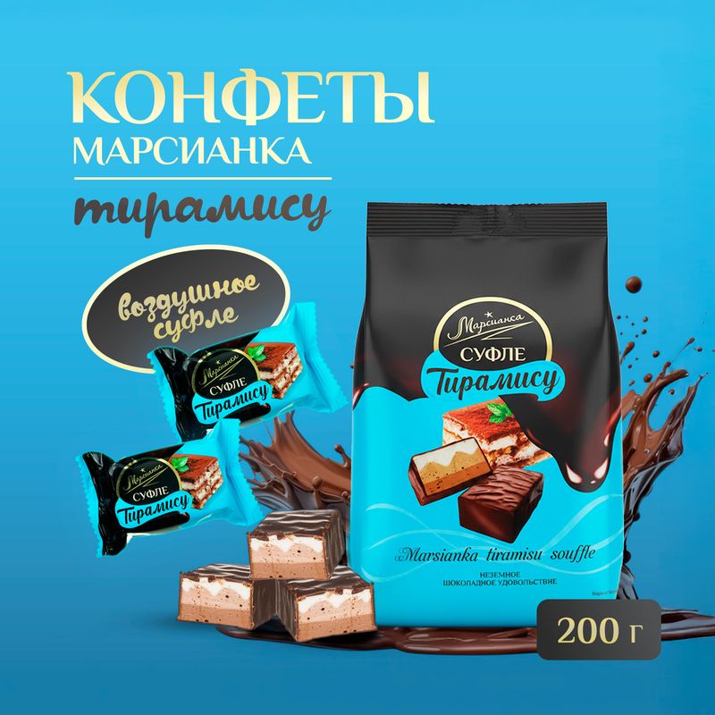 Конфеты сбивные глазированные "Тирамису", Марсианка – лёгкий десерт на основе воздушного суфле, покрытый тёмной глазурью. Нежная сливочно-кофейная начинка со вкусом классического тирамису станет отличным дополнением к чаю или кофе. Масса нетто: 200 г.