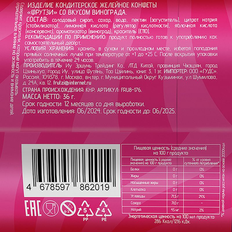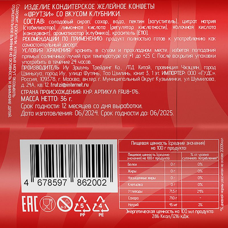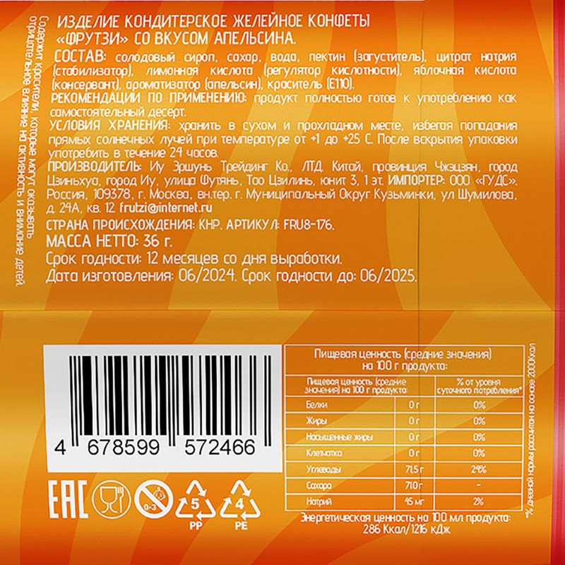 Конфеты желейные "Фрутзи", 36 г, в ассортименте