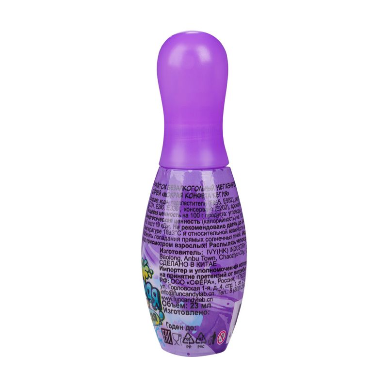 Мокрая конфета "Кегля" в форме спрея – для любителей сладких экспериментов! Брызните в рот, и почувствуете вкус конфеты! Объём: 23 мл. Товар представлен в ассортименте.