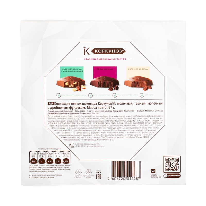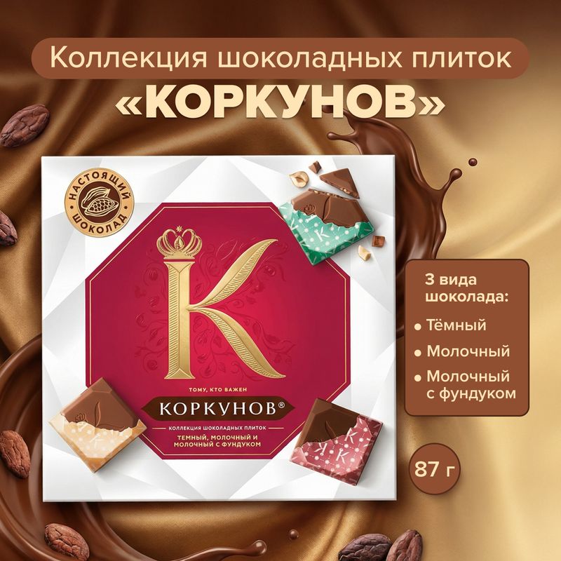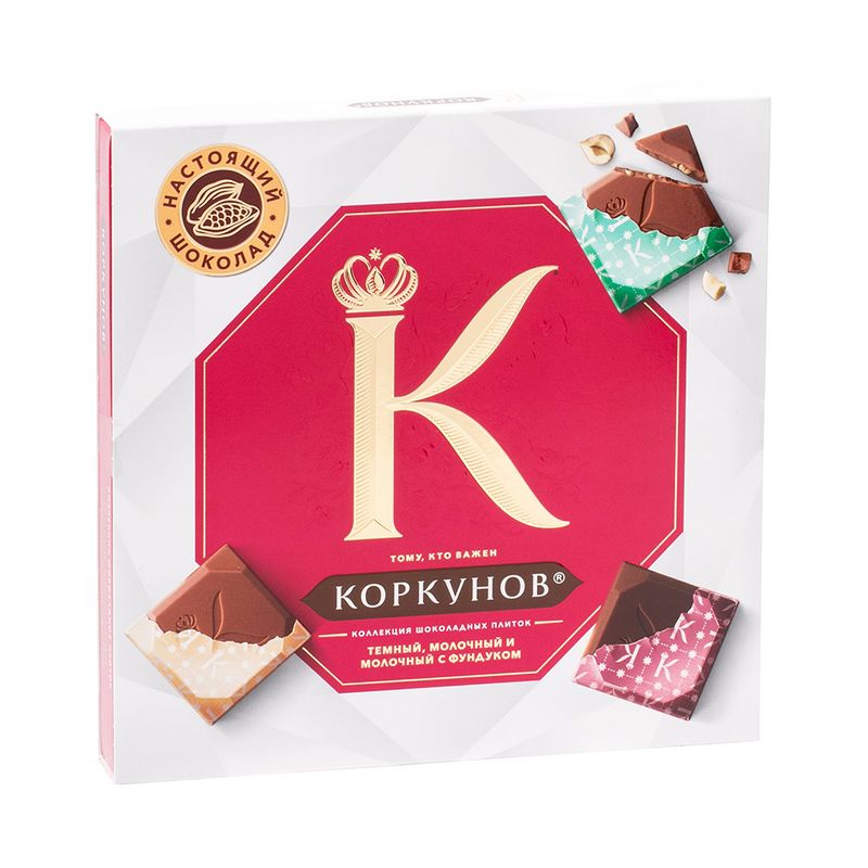 Конфеты "Коллекция шоколадных плиток", Коркунов – это настоящий подарок для ценителей изысканных десертов! В набор входит 3 вида шоколадных плиток: тёмная, молочная и молочная с фундуком. Без консервантов, красителей и усилителей вкуса. Масса нетто: 87 г.