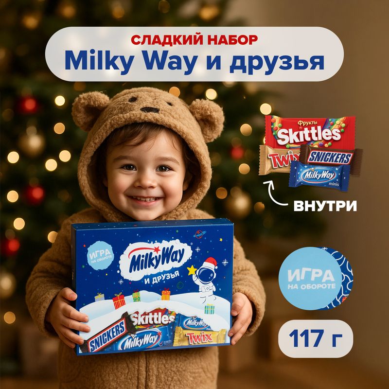 Конфеты "Milky Way и друзья" — подарочный набор с любимыми сладостями. Увлекательная игра на упаковке! Масса нетто: 117 г.