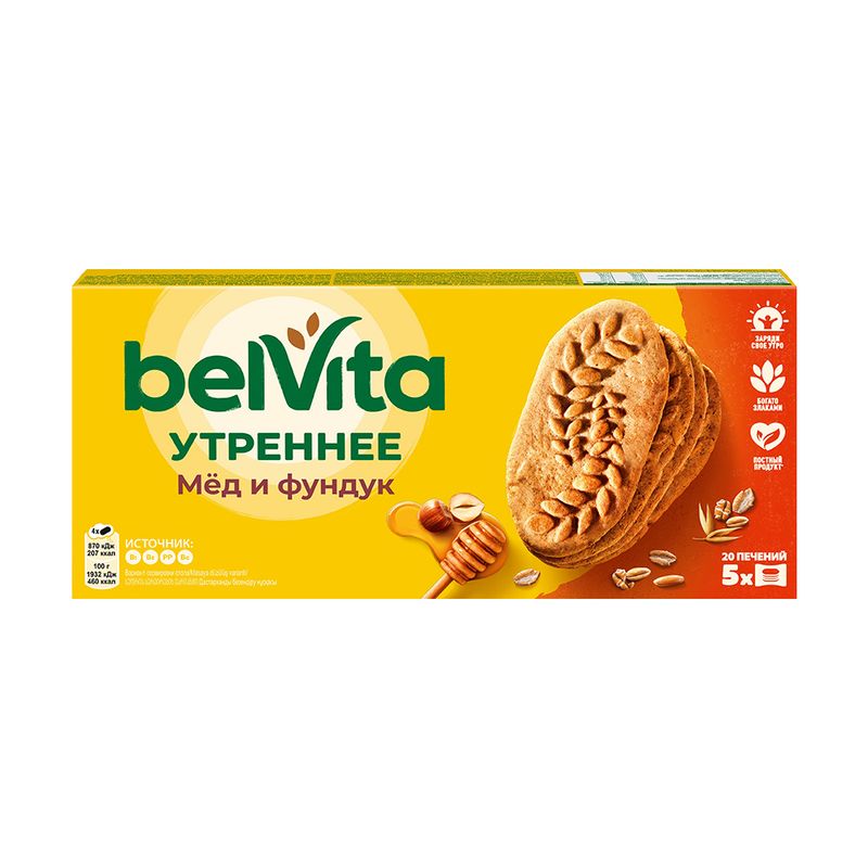 Печенье "Утреннее", BelVita, со вкусом мёда и фундука делает завтрак ещё вкуснее и питательнее. Отлично сочетается с чаем, кофе, молоком и другими напитками. В коробке 5 порционных упаковок, которые удобно брать с собой. Масса нетто: 225 г.