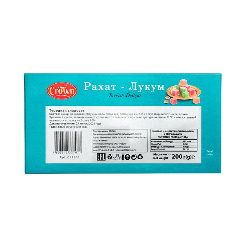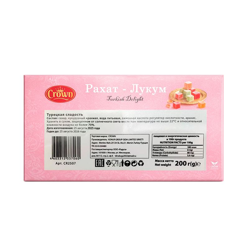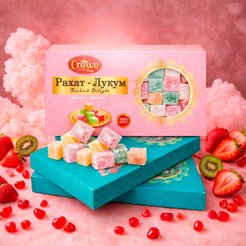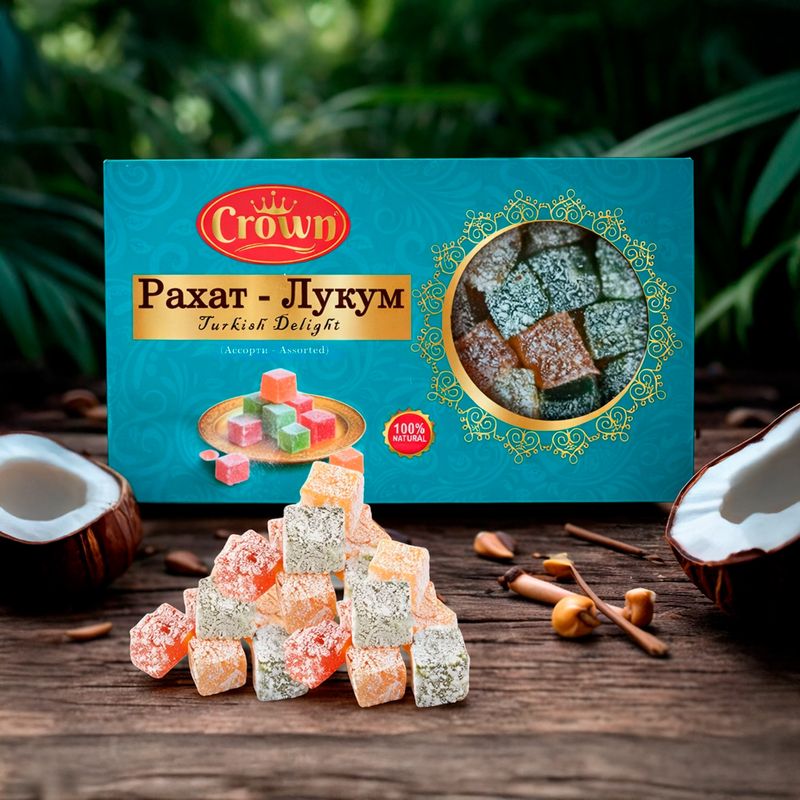Рахат-Лукум, Crown – это традиционная турецкая сладость с мягкой, нежной текстурой и яркими вкусами. Отлично подойдёт к чаю или кофе, а также в качестве угощения для гостей. Масса нетто: 200 г. Товар представлен в ассортименте.