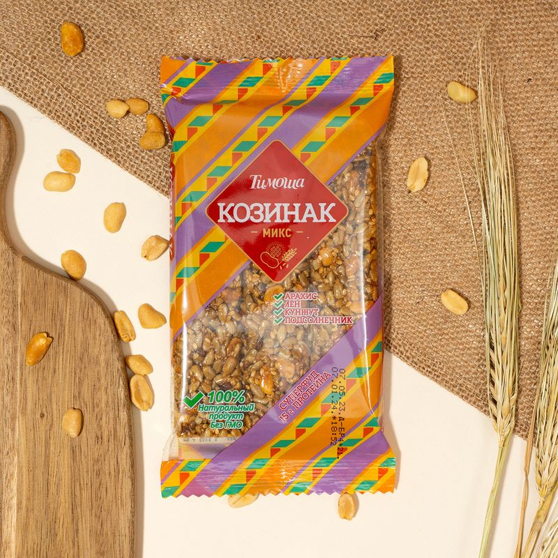 Козинак “Микс“, Тимоша – это восточная сладость, которая станет отличным перекусом в течение дня. В состав входят лён, арахис, кунжут и подсолнечник. В меру сладкий и хорошо утоляет голод. Масса нетто: 150 г.
