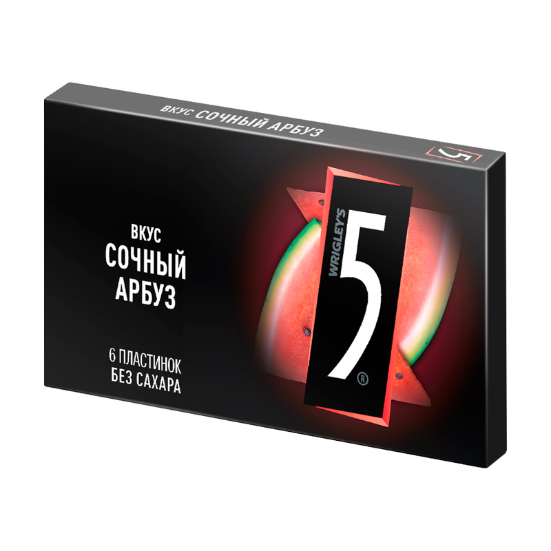 Жевательная резинка, Wrigley's 5, с ярким арбузным вкусом и приятной текстурой и поможет быстро освежить дыхание. Стильная чёрная пачка легко помещается в карман и в сумочку. Без сахара. В упаковке 6 пластинок. Масса нетто: 15,6 г.