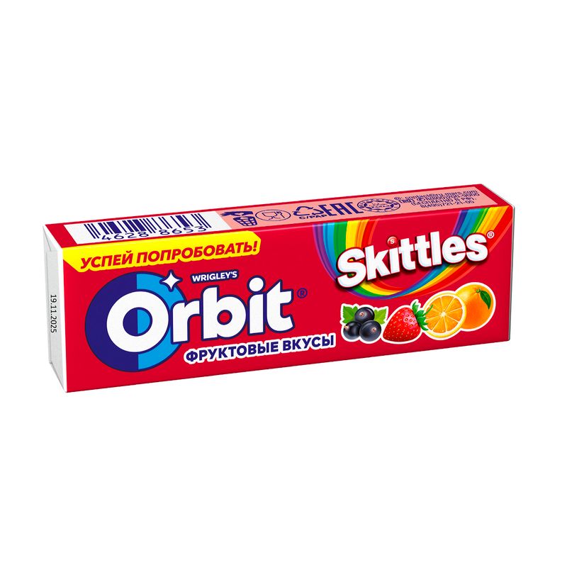 Жевательная резинка "Фруктовые вкусы Skittles", Орбит – это ассорти со вкусами чёрной смородины, клубники и апельсина! Освежает дыхание и дарит яркие фруктовые нотки. Масса нетто: 13,6 г.