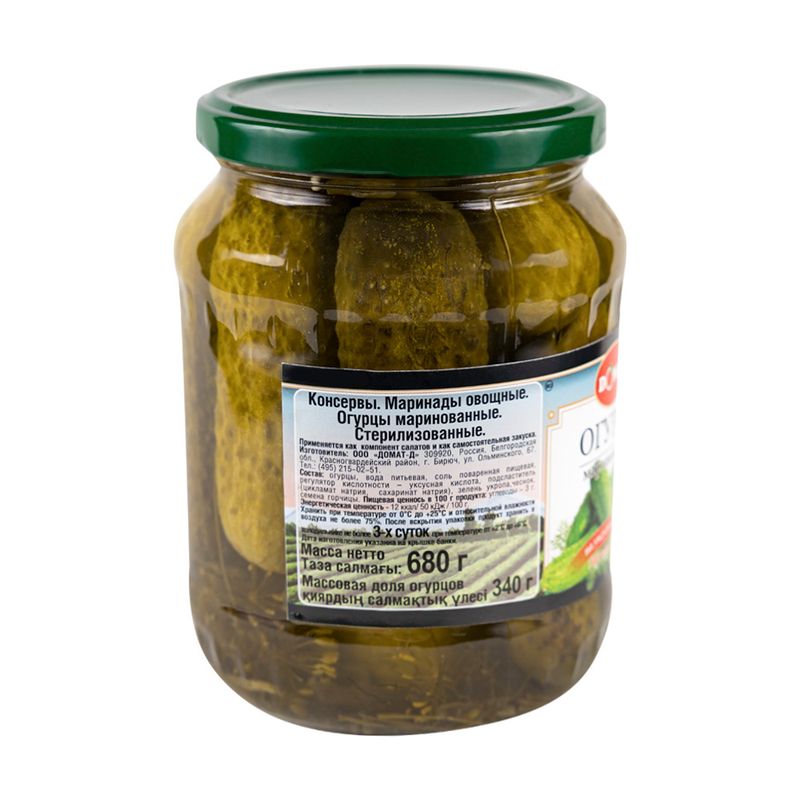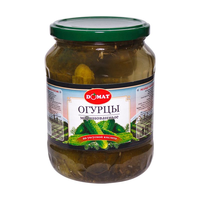 Огурцы маринованные, Domat, станут прекрасной закуской или дополнением к блюду. Масса нетто: 680 г.
