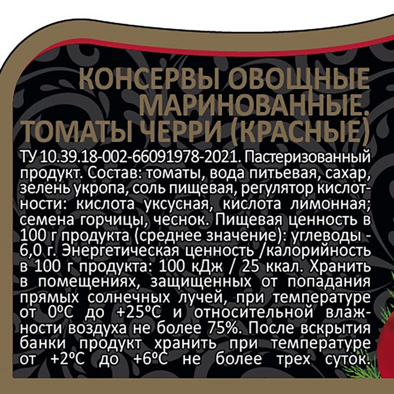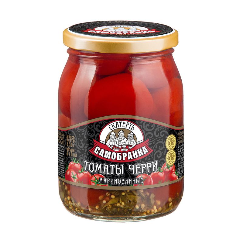Томаты черри маринованные — ароматные и сочные. Прекрасны в качестве закуски или дополнения к горячим блюдам. Объём: 370 мл.