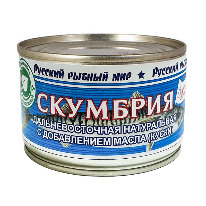 Скумбрия натуральная дальневосточная, Русский Рыбный Мир, с добавлением масла – отличное дополнение к салатам, закускам и горячим блюдам. Масса нетто: 250 г.