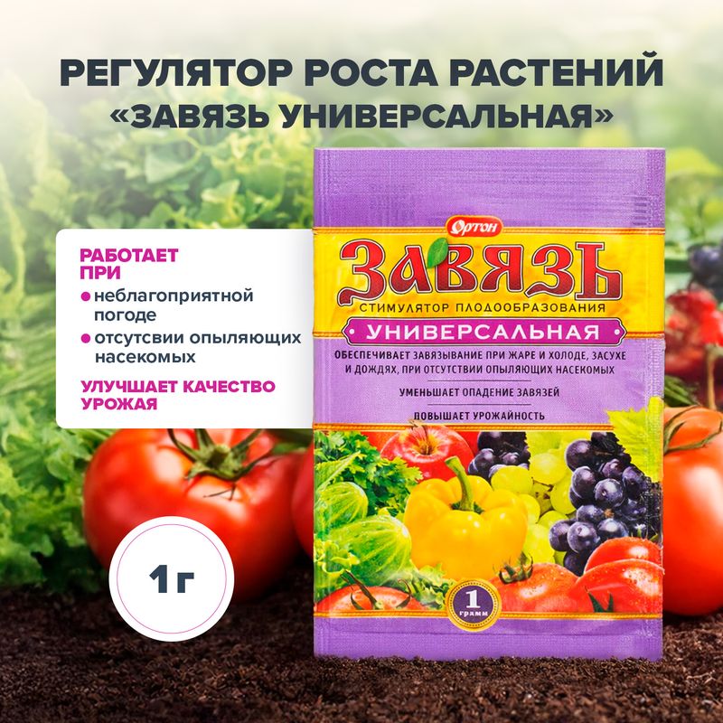 Регулятор роста растений "Завязь универсальная" стимулирует плодообразование даже при неблагоприятных погодных условиях и отсутствии опыляющих насекомых. Удобрение повышает устойчивость к заболеваниям и весенним заморозкам и улучшает качество урожая. Уменьшает опадение завязей. Перед использованием ознакомьтесь с инструкцией и мерами предосторожности на упаковке. Масса нетто: 1 г.