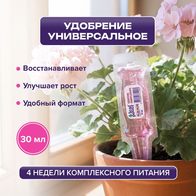 Удобрение универсальное, Fertika, восстанавливает ослабленные растения, стимулирует и продлевает цветение, улучшает активный рост зелёной массы. Сделано в формате ампулы, легко использовать. Перед применением ознакомьтесь с инструкцией на упаковке. В упаковке 1 ампула (рассчитана на 4 недели комплексного питания). Объём: 30 мл.
