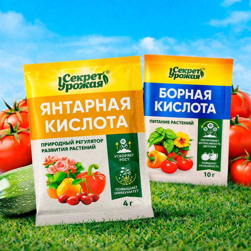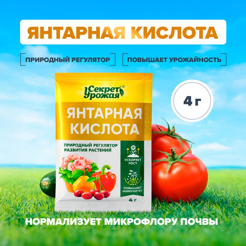 Янтарная кислота, Секрет урожая – природный регулятор развития растений. Ускоряет процессы роста, цветения и созревания. Повышает урожайность. Нормализует микрофлору почвы. Помогает растениям легче восстанавливаться после пересадки. Перед использованием ознакомьтесь с инструкцией и мерами предосторожности на упаковке. Массовая доля янтарной кислоты в веществе: 99,6%. Масса нетто: 4 г.