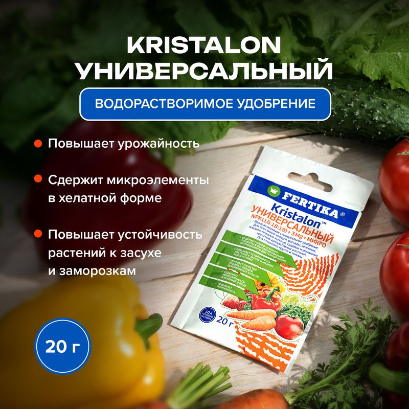 Удобрение "Kristalon Универсальный", FERTIKA, подходит для всех видов овощей, рассады, зелёных, плодово-ягодных культур, садовых и домашних цветочно-декоративных растений. Улучшает качество плодов и овощей, декоративных культур. Сдержит микроэлементы в хелатной форме. Повышает урожайность. Перед применением ознакомьтесь с инструкцией и мерами предосторожности на упаковке. Экономичный расход: содержимого упаковки хватит на 10 л готового раствора. Масса нетто: 20 г.
