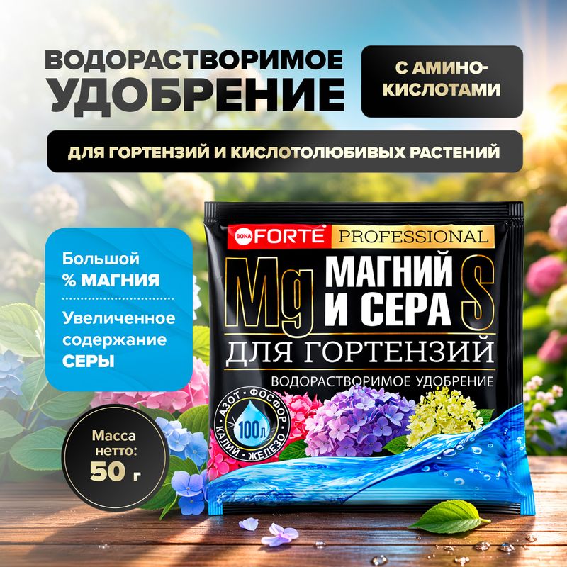 Удобрение водорастворимое для гортензий "Магний и сера", BONA FORTE, также подходит для голубики, брусники, клюквы и других растений, предпочитающих кислую почву. Содержит фосфор, железо, азот, калий. Перед применением ознакомьтесь с инструкцией и мерами предосторожности на упаковке. Масса нетто: 50 г.