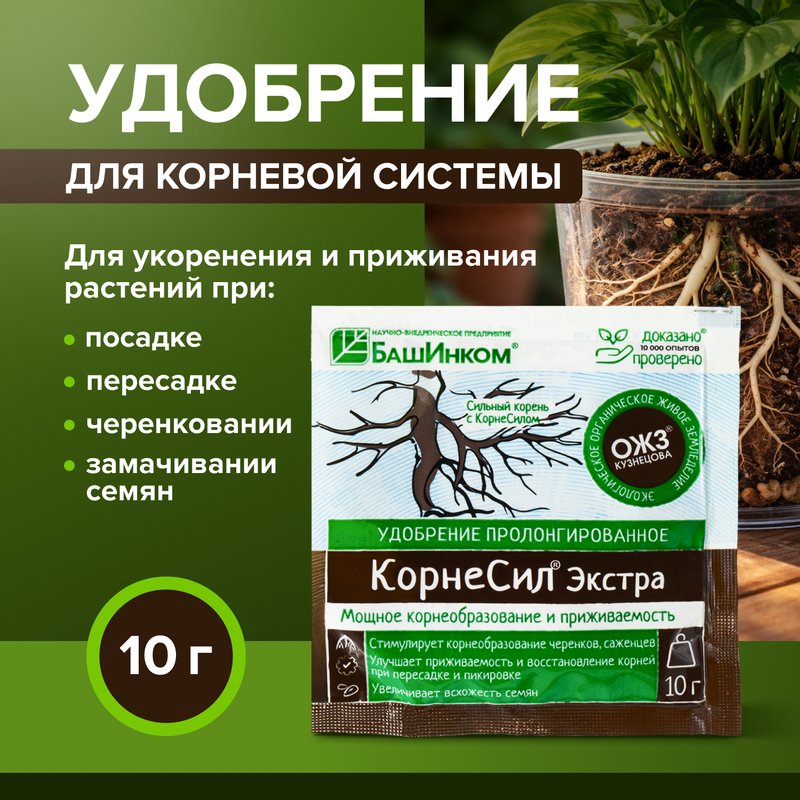 Удобрение пролонгированное "Корнесил Экстра", БашИнком – органический препарат, который способствует корнеобразованию черенков, саженцев, рассады и луковиц. Улучшает приживаемость и восстановление корней при пересадке и пикировке. Увеличивает всхожесть семян. Перед применением ознакомьтесь с инструкцией и мерами предосторожности на упаковке. Масса нетто: 10 г.