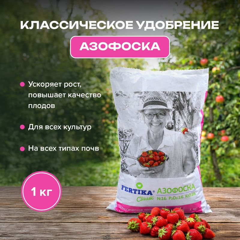 Удобрение "Азофоска", FERTIKA, содержит основные питательные элементы, необходимые растениям. Ускоряет рост, повышает качество плодов, увеличивает срок их хранения. Эффективно для всех культур и на всех типах почв. Перед применением ознакомьтесь с инструкцией и мерами предосторожности на упаковке. Масса нетто: 1 кг.