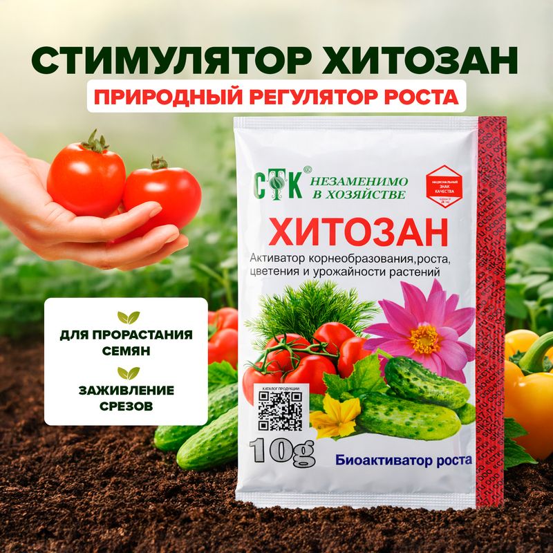 Стимулятор "Хитозан", СТК – это природный регулятор роста для обработки овощных и зелёных культур, садовых деревьев и кустарников, комнатных растений. Способствует прорастанию семян, ускоряет переход к плодоношению, способствует заживлению срезов при обрезке, увеличивает продолжительность цветения, повышает устойчивость растений к болезням. Не уступает по свойствам янтарной кислоте. Перед использованием ознакомьтесь с инструкцией и мерами предосторожности на упаковке. Масса нетто: 10 г.