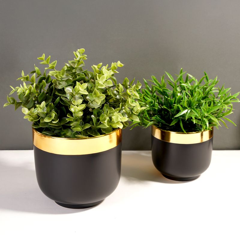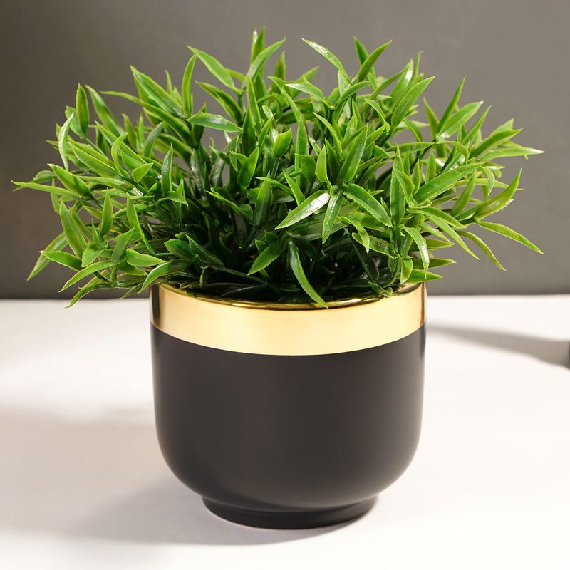 Горшок для цветов с чёрным матовым оттенком и изящным золотым ободком прекрасно подойдёт для небольших комнатных растений. Диаметр: 11 см. Состав: керамика. Соберите всю коллекцию "Чёрное золото" и дополните интерьер элегантными деталями!