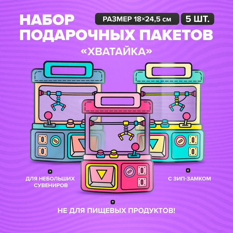 Набор пакетов с зип-замком "Хватайка", PARTY, в ярком дизайне – отличный выбор для небольших подарков и сувениров! В наборе 5 пакетов. Размер в сложенном виде: 18х24,5 см. Состав: полиэтидентерефталат, литой полипропилен, полифениленэфир. Товар представлен в ассортименте.