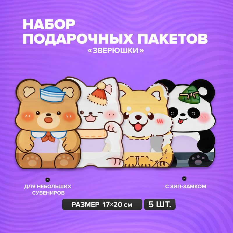 Набор пакетов с зип-замком "Зверюшки", PARTY, в ярком дизайне – отличный выбор для небольших подарков и сувениров! В наборе 5 пакетов. Приблизительный размер в сложенном виде: 17х20 см. Состав: полиэтилентерефталат, литой полипропилен, полифениленэфир. Товар представлен в ассортименте.