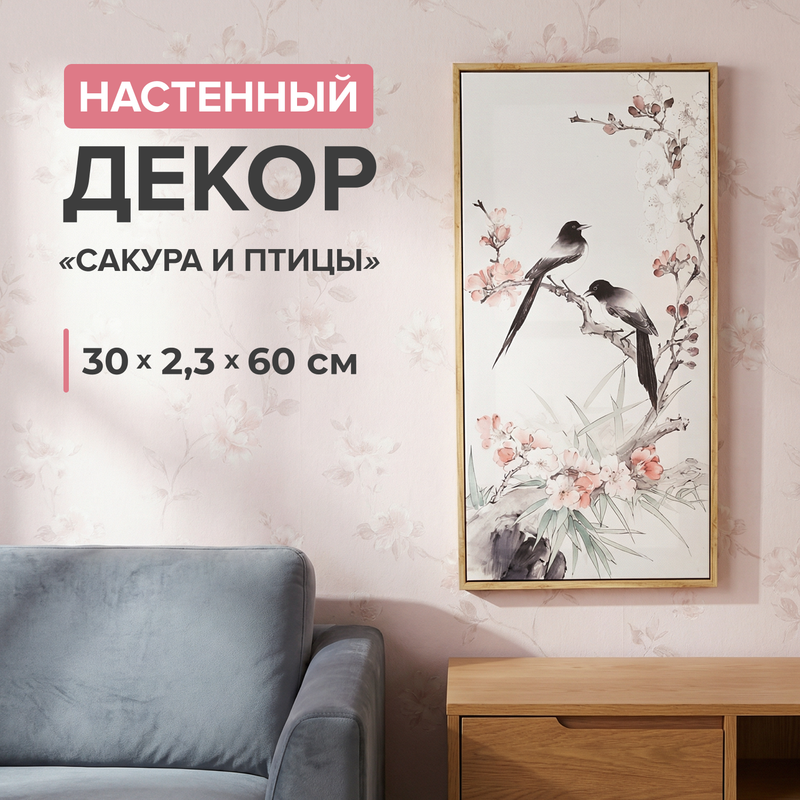 Настенный декор "Сакура и птицы" поможет добавить интерьеру изящный акцент. Нежный рисунок с цветущей сакурой и птицами создаёт атмосферу уюта и спокойствия. Подойдёт для оформления гостиной, спальни или прихожей. Размер: 30х2,3х60 см. Состав: полистирол, полиэстер, МДФ, бумага, сталь, полипропилен. Товар представлен в ассортименте.