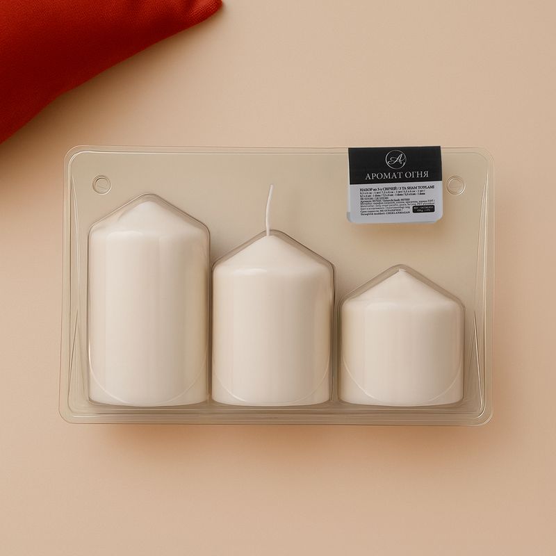 Набор свечей "Аромат огня" украсит Ваш дом и поможет создать уютную расслабляющую атмосферу. Соблюдайте правила пожарной безопасности! В наборе 3 свечи: 9,5х6 см, 7,5х6 см, 5,5х6 см. Приблизительный вес: 450 г. Состав: парафин пищевой, хлопок. Товар представлен в ассортименте.