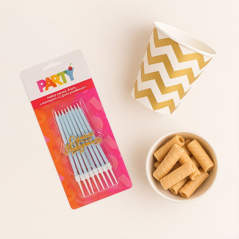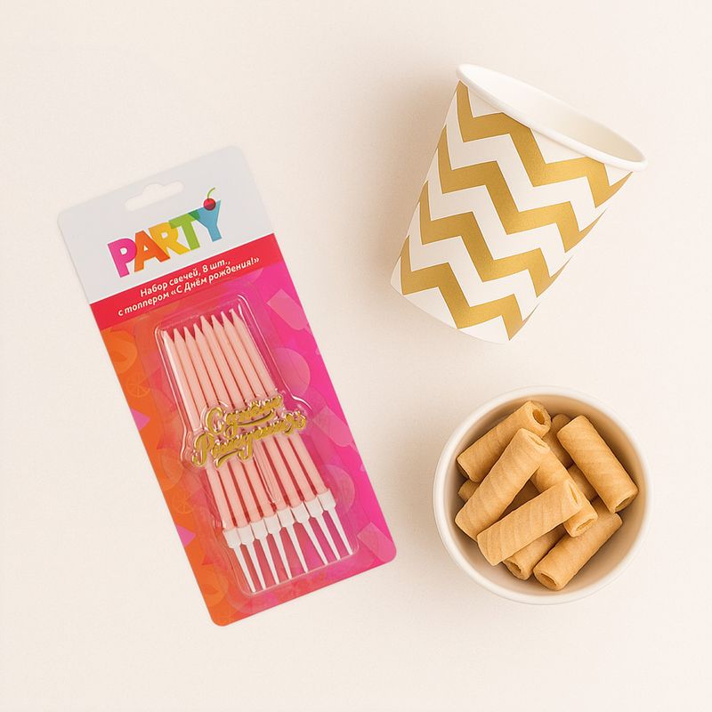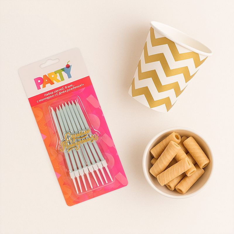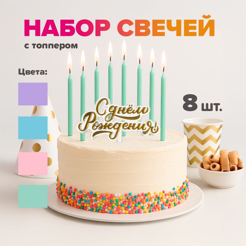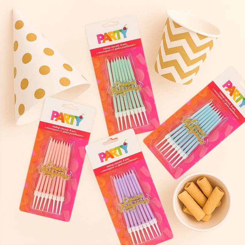 Набор свечей с топпером "С Днём рождения!", Party, 8 шт., в ассортименте