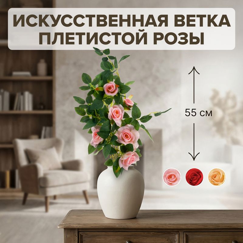 Ветка плетистой розы – это искусственный цветок, который станет украшением Вашего интерьера. Длина: 55 см. Состав: полипропилен, полиэстер, сталь. Товар представлен в ассортименте.