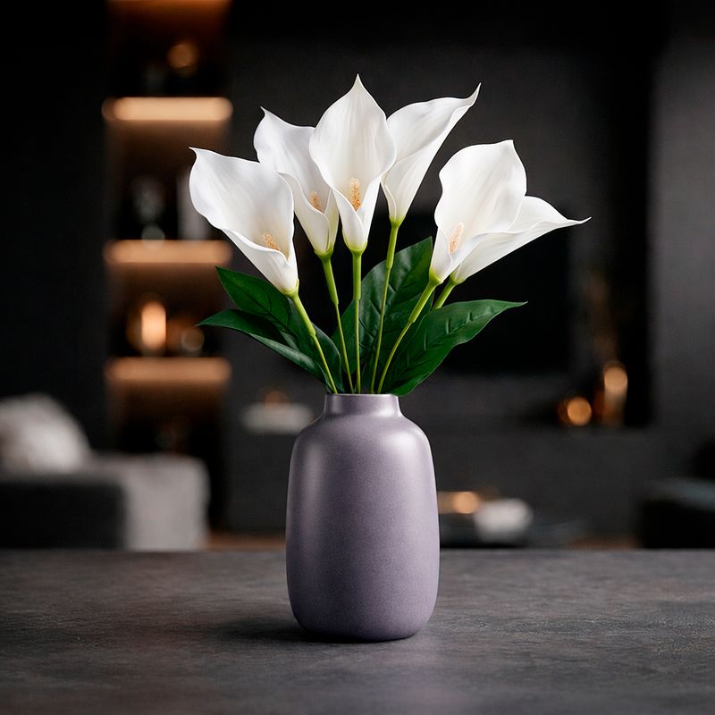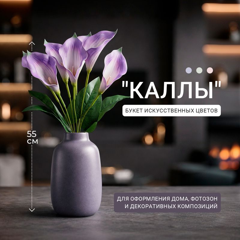 Букет искусственных цветов "Каллы" станет элегантным украшением интерьера. Реалистичная форма и высокая детализация цветков придают композиции выразительный и аккуратный вид. Подойдёт для оформления дома, фотозон и декоративных композиций. Длина: 55 см. Состав: полипропилен, полиэстер, сталь, ЭВА. Товар представлен в ассортименте.
