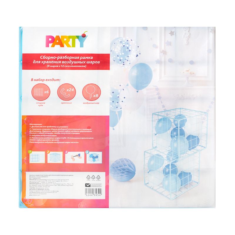 Сборно-разборная рамка для хранения воздушных шаров, Party, пригодится для подготовки к празднику и вечеринке. В комплекте: 6 сторон куба, 24 крепления, 8 шаров. Размер рамки: 30х30х30 см. Подробная инструкция по сборке указана на упаковке. Шары рекомендуется надувать насосом. Состав: полипропилен, латекс. Товар представлен в ассортименте.