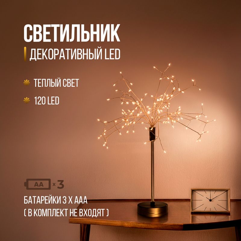 Декоративный LED светильник – это отличный подарок близкому человеку. Очаровательный светильник в виде деревца украсит рабочий стол или тумбу. Поможет создать романтическую и успокаивающую атмосферу. Количество светодиодов: 120 LED. Световой поток: 12 лм. Работает от 3 батареек типа АА, в комплект не входят. Перед использованием аккуратно расправьте веточки, ознакомьтесь с инструкцией по применению и мерами предосторожности на упаковке. Состав: полипропилен, алюминий, медь. Товар представлен в ассортименте.