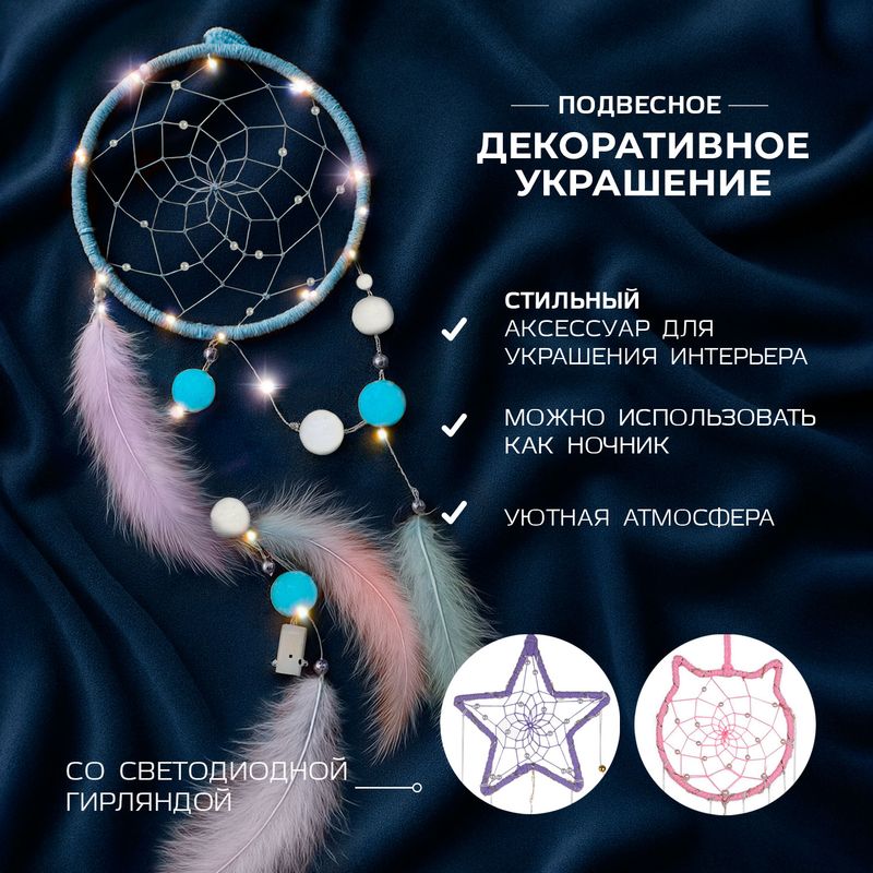 Декоративное подвесное украшение со светодиодной гирляндой – оригинальный предмет декора для Вашего дома. Можно использовать в качестве ночника. Перед использованием ознакомьтесь с руководством по эксплуатации внутри упаковки. Работает от 3 батареек AG13, входят в комплект. Количество светодиодов: 18 LED. Световой поток: 100 лм. Мощность: 0,5 Вт. Состав: перо, полиэстер, сталь, хлопок, полипропилен, медная проволока. Товар представлен в ассортименте.